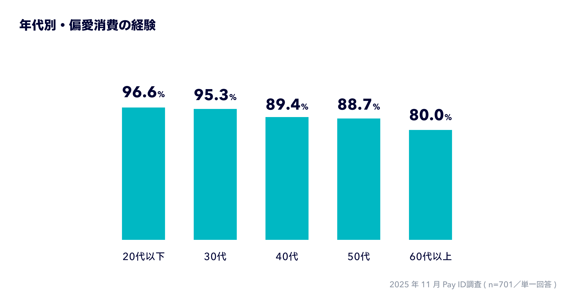 年代別に見ると、「20代以下」が96.6%、「30代」が95.3%と9割を超え、「40代」が89.4%、「50代」が88.7%、「60代以上」が80.0%と、調査をした全ての年代で8割以上の方が偏愛消費を経験していることがわかります。