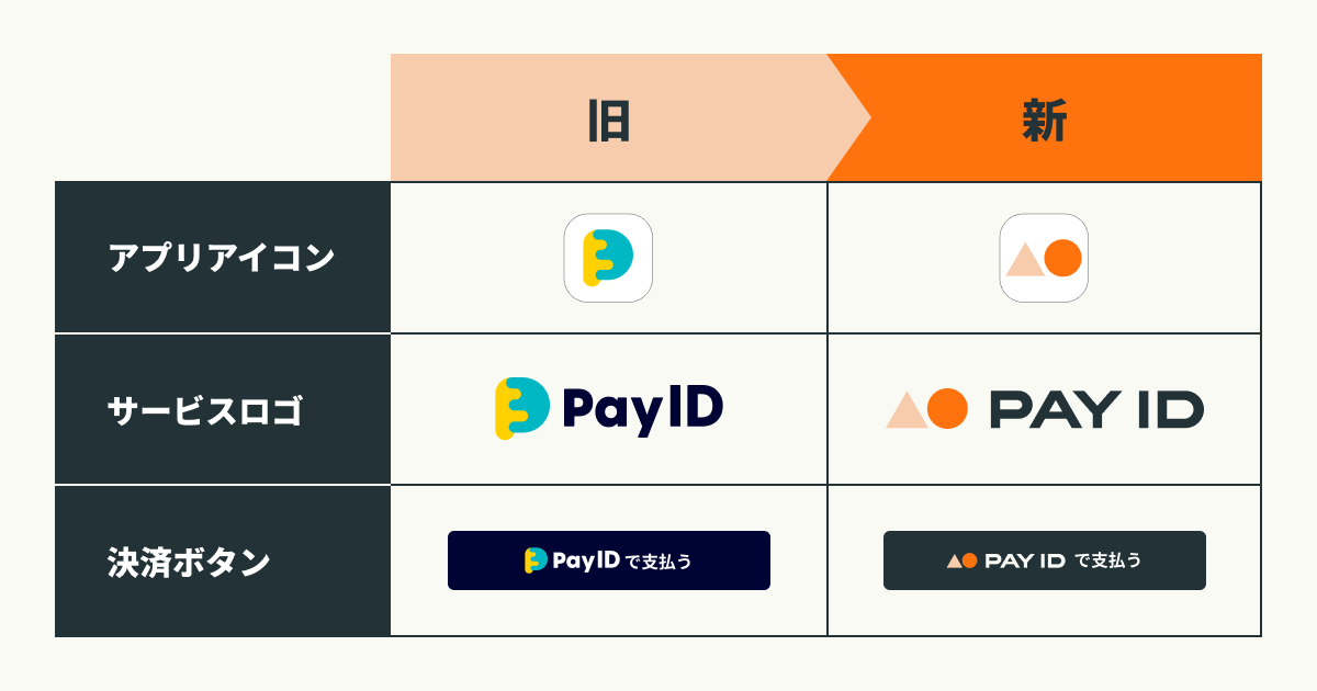 新しいサービスロゴは、三角形と円を横に並べたシンプルなデザインで、三角形は「PAY ID」を利用する「ショップさま」を、円は「購入者さま」を表しています。テーマカラーには、三角形にやわらかなベージュを、円にオレンジを採用いたしました。